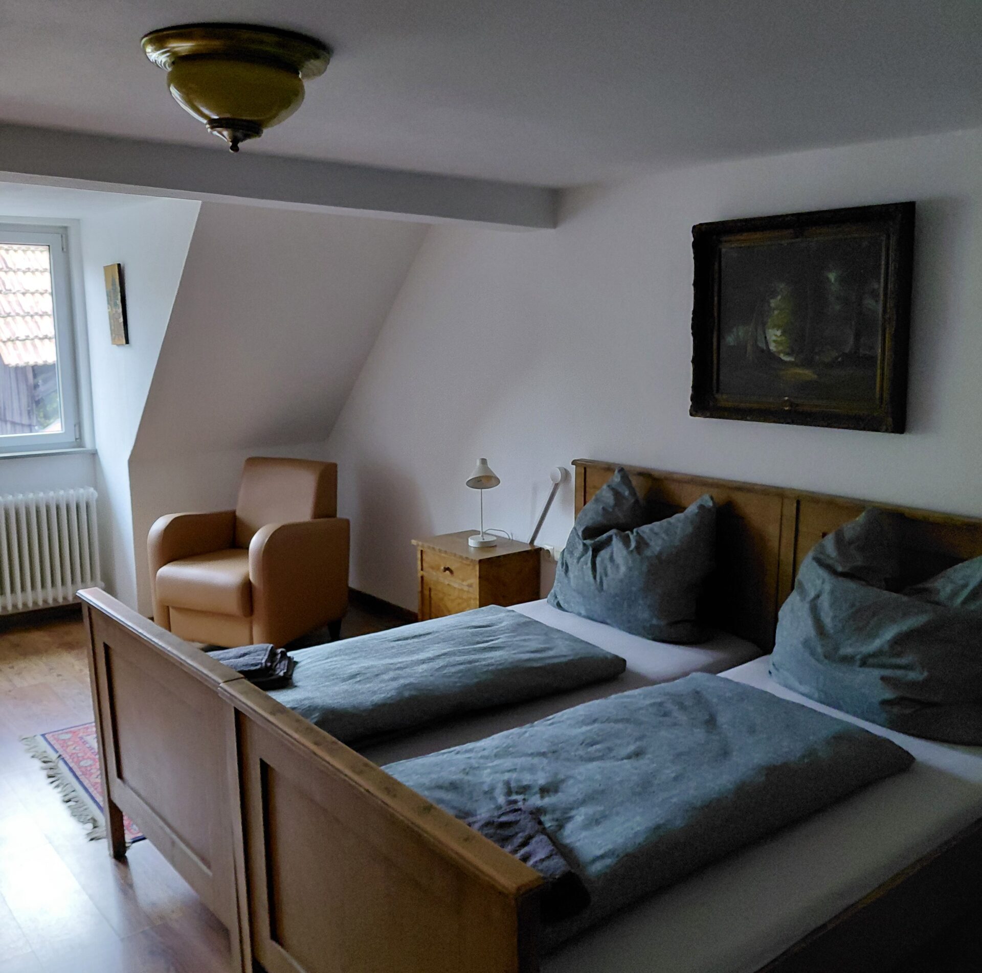 Een fijne kamer boven in het huis, met kast, zitje en groot tweepersoonsbed.